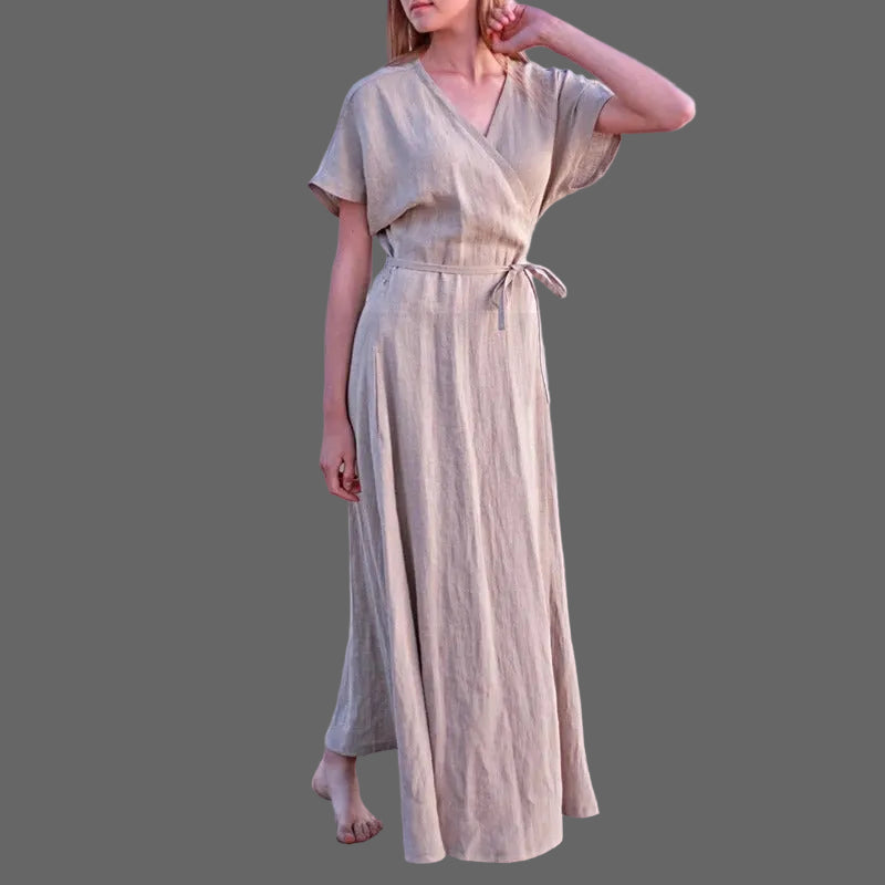 This maxi dress features a wrap-style front with a V-shaped neckline and a tie closure at the waist. The design is beige with a soft, slightly textured surface. Short sleeves extend loosely over the upper arms, contributing to the relaxed upper silhouette. The skirt falls to ankle length with a straight, flowing shape that moves gently from the waist down. The overall fit is defined at the waist and loose through the skirt.
